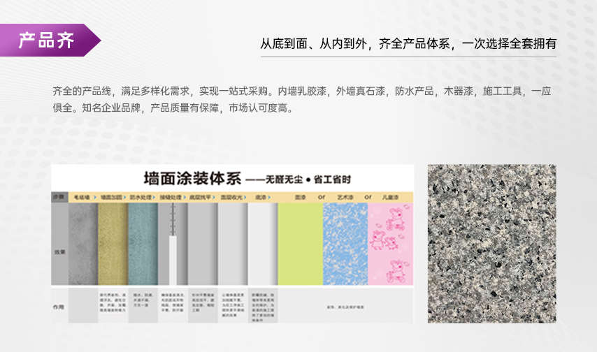 嘉麗士水漆作為美涂士旗下的高端水漆品牌始創(chuàng)于1997年,嘉麗士水漆 總部設(shè)于“涂料之鄉(xiāng) ”順德,亦于四川崇州、河南濮陽(yáng)等地建立智能化 生產(chǎn)基地,是一家專(zhuān)業(yè)從事內(nèi)外墻涂料、家具漆、工程漆、藝術(shù)漆、防 水輔材、膠黏劑、窗簾等墻面保...
