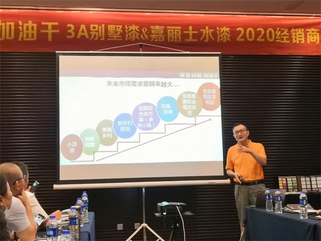 嘉麗士事業(yè)部總經(jīng)理焦坤朋在會(huì)上提出,將對傳統(tǒng)乳膠漆+商裝水漆+防水+藝術(shù)漆產(chǎn)品的優(yōu)化升級,成立商裝水漆推廣小組幫扶經(jīng)銷商,完成工程工裝的雙包涂裝,并根據(jù)實(shí)際情況,對大型工程項(xiàng)目給予幫扶支持。