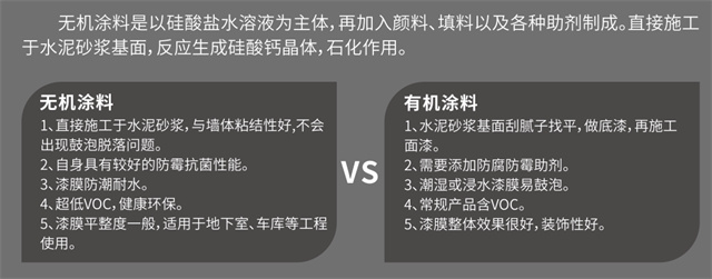 相對(duì)于常見(jiàn)的有機(jī)涂料,無(wú)機(jī)涂料具有:天然無(wú)污染,壽命長(zhǎng),顏色保色持久,附著性能強(qiáng),不易龜裂、起泡、脫落,透氣性良好,防火阻燃,易清潔,能夠有效抵御苔蘚、真菌滋生等優(yōu)點(diǎn)。