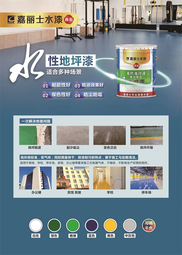 嘉麗士水漆·水性地坪漆產(chǎn)品,是針對室內(nèi)辦公場所、生活區(qū)域、酒店、民宿超市,飯店、學(xué)校等地坪環(huán)境需求而設(shè)計(jì)的多功能涂裝體系,采用改性水性丙烯酸樹脂研制而成,有耐磨性好、抗壓和防滑等特點(diǎn)。有很強(qiáng)的耐紫外線功能,保色性佳,不易褪色,可用于各種室內(nèi)外地坪休閑運(yùn)動場所裝飾。