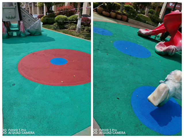 涂裝后的兒童游樂區(qū)地坪色彩鮮艷,藍(lán)、紅、綠搭配圓形圖案,充分展現(xiàn)了童趣,與周邊游樂設(shè)施一起,構(gòu)成了充滿夢幻童話的空間!