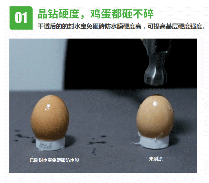 封水寶免砸磚強(qiáng)效耐候防水膜,是以優(yōu)質(zhì)天冬聚脲樹脂、精選助劑、顏填料、固化劑為改性異氰酸脂組成的雙組份產(chǎn)品,混合后產(chǎn)生交聯(lián)反應(yīng)形成高分子透明防水膜,適用于屋頂,水池、廚房、衛(wèi)生間瓷磚表面滲水修復(fù)、內(nèi)墻表面防水防潮處理,讓你重做防水不砸磚,省時(shí)、省工更省錢。